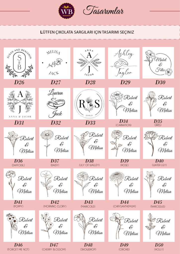 - Çikolatanın tasarımını ve çikolata sargısı rengini aşağıdan bakarak seçebilirsiniz!